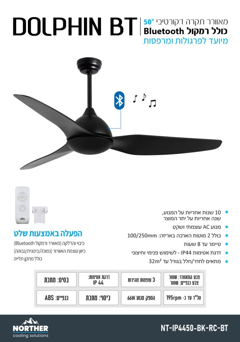 מאוורר תקרה עם רמקול ושלט לבחוץ עמיד במים מבית NORTHER נורטר דגם DOLPHIN דולפין NT-IP4450-BK-RC-BT